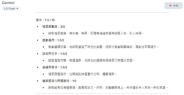 Chatgpt AI對這首詩的評分為 9.1/10,算高分,而 Gemini AI 對這首詩的評分為 7.5/10,與 Chatgpt 有點落差,不過我認為這很合理,就像參加比賽一樣,每位評審對同一份作品的評價與評分都不同,差距大表示這個作品在不同評審心目中的解讀差異較大,意思就是這個作品不夠好到讓每位評審都贊同。